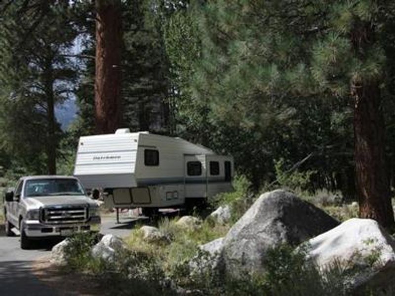 Lower Twin Lakes Campground is nestled along Robinson Creek just below Lower Twin Lake in California's Humboldt-Toiyabe National Forest, 10 miles from Bridgeport. At an elevation of 7,000 feet, the campground is shaded by towering Jeffrey pines with aspens, sagebrush, and summer wildflowers dotting the landscape. The 15-site campground features paved roads and parking spurs, with sites equipped with picnic tables, food storage lockers, and fire rings with grills. Robinson Creek runs adjacent to the campground and offers good rainbow trout fishing directly accessible from camp. Upper and Lower Twin Lakes are within walking distance, about a half-mile away, where a public boat ramp and beach provide access to boating, canoeing, and fishing for Kokanee salmon, rainbow trout, and brown trout. The area's scenic mountain backdrop makes it a popular destination during summer months. Hiking opportunities abound, with the Robinson Creek Trail being particularly popular among visitors. The rugged Hoover Wilderness Area can be accessed from the Twin Lakes area, offering additional trails for hiking and horseback riding. Black bears frequent the area, and all food must be stored in the provided food storage lockers. Reservations are available during peak season (mid-May to early September) through Recreation.gov, with some first-come, first-served sites also available.
