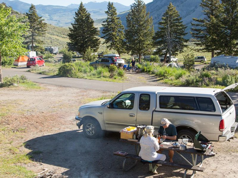 Mammoth Campground is Yellowstone National Park's only year-round campground, situated at 6,200 feet elevation in the Mammoth Hot Springs area, just five miles south of the North Entrance near Gardiner, Montana. The campground offers 85 sites set in a high sagebrush steppe environment with scattered juniper and Douglas fir trees providing shade during summer months. The campground's location in the northern section of the park provides exceptional wildlife viewing opportunities. Elk, bison, pronghorn, and mule deer frequently pass through the area depending on the season, and elk are particularly common around Mammoth Hot Springs. The campground sits within walking distance of the famous Mammoth Hot Springs terraces, where visitors can explore boardwalks above steaming hydrothermal features and vibrant travertine formations. The historic Fort Yellowstone area is also nearby. Recreational opportunities abound in the area, including hiking, fishing, and wildlife viewing. The road from the North Entrance winds through the Gardner River canyon past sandstone cliffs and ancient mudflows, with diverse vegetation including Rocky Mountain juniper, cottonwood, Douglas-fir, and willows along the river. Birds such as eagles, osprey, dippers, and kingfishers inhabit the canyon, while bighorn sheep can be spotted on steeper terrain. During winter, visitors can ski or snowshoe among the Upper Terraces' hydrothermal features.