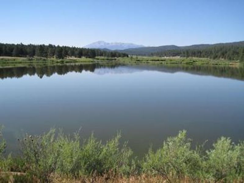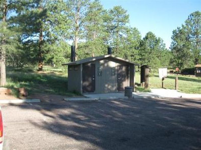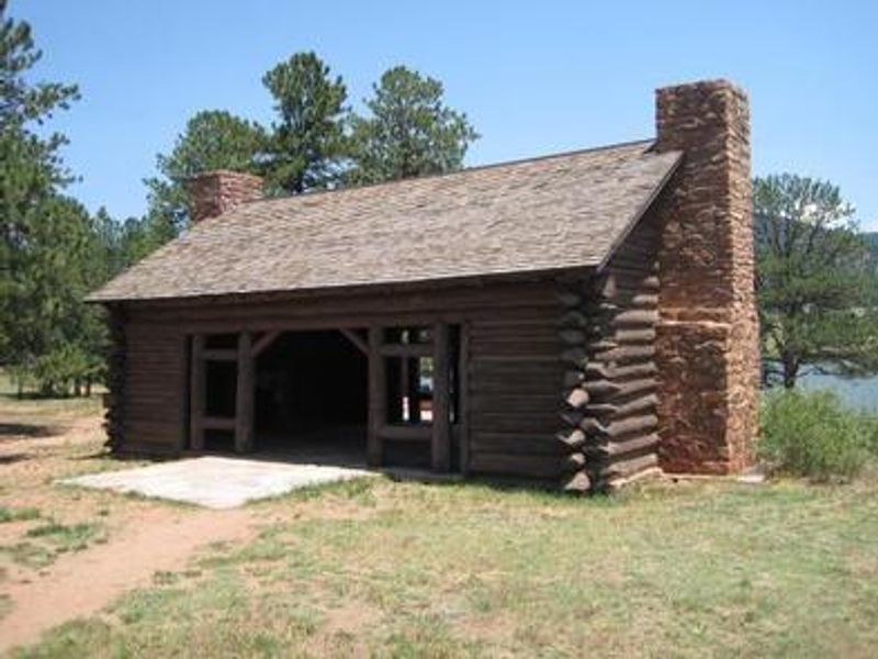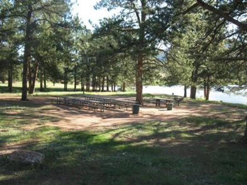 Manitou Lake Pavilion is a group day-use picnic facility located within Manitou Lake Picnic Area in Pike National Forest, 7 miles north of Woodland Park, Colorado. Situated on the west side of the 5-acre Manitou Lake reservoir at 7,700 feet elevation, this open-air pavilion provides a scenic mountain setting for group gatherings of up to 50 people. The pavilion features two fireplaces, group picnic tables, and a large cooking grill. Adjacent facilities include potable water hydrants and vault toilets. A grassy meadow area allows for outdoor sports and activities. Manitou Lake is fed by Trout Creek and is stocked with trout, making it a popular year-round fishing destination. Swimming and wading are prohibited in the reservoir. The area is known for excellent birding with diverse waterfowl and land bird species. The paved Centennial Bike Trail (Trail #699) can be accessed from the picnic area and connects to nearby Painted Rocks, Colorado, and South Meadows Campgrounds over approximately 4.2 miles. A hiking trail (Trail #670) loops around the lake. The terrain combines grassy meadows with ponderosa pine forest. Nearby attractions include Pikes Peak and Garden of the Gods Park. The facility is managed by the U.S. Forest Service in partnership with Rocky Mountain Recreation Company.