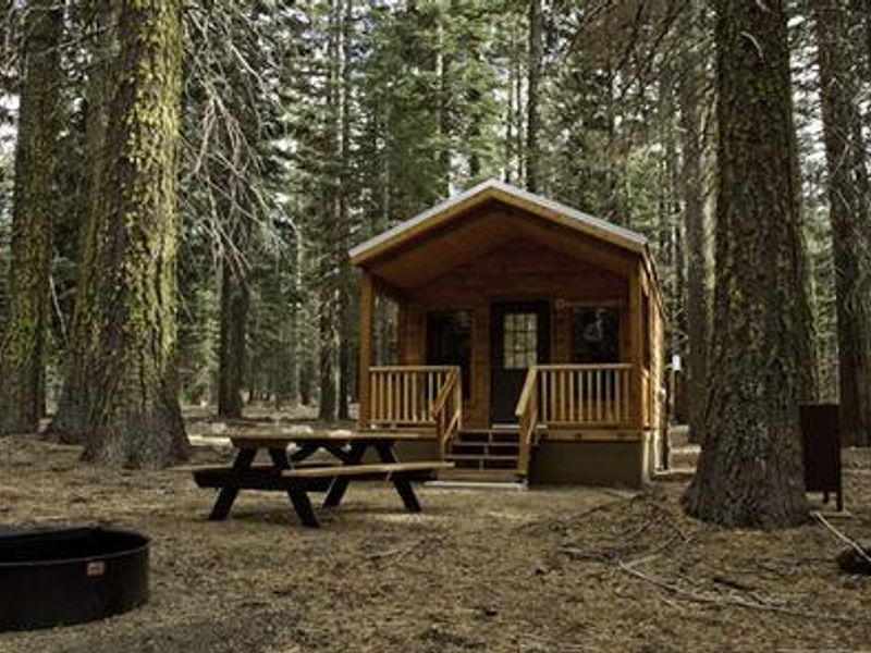Situated at 5,890 feet elevation near the northwest entrance to Lassen Volcanic National Park, the Manzanita Lake Camping Cabins provide convenient access to the park's volcanic landscapes and recreational opportunities. Built in 1972, these 20 rustic cabins are available in three configurations: one-room cabins sleeping three, two-room cabins sleeping six, and bunkhouse cabins sleeping eight. Each cabin includes firm mattresses on beds or bunks, a lockable door, propane heat, picnic table, fire ring, and bear-proof food storage locker. The cabins are located within walking distance of Manzanita Lake, a popular catch-and-release fishing destination with views of Lassen Peak. The Manzanita Lake Camper Store nearby offers groceries, camping supplies, gasoline, a cafe with espresso and sandwiches, and kayak rentals. Pay showers, flush toilets, and laundry facilities are a short walk from the cabins. The Loomis Museum and ranger station are adjacent to the campground, with educational programs offered at the amphitheater. Lassen Volcanic National Park sits at the junction of the Cascade Range, Sierra Nevada, and Great Basin, creating diverse habitats for over 700 flowering plant species and 250 native animal species. The park contains 300 volcanic domes and numerous hydrothermal features including mud pots and steam vents. Manzanita Lake offers non-motorized boating, and the park features over 150 miles of hiking trails ranging from family-friendly walks to challenging backcountry routes.