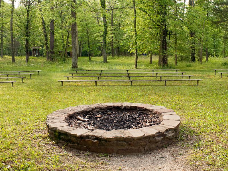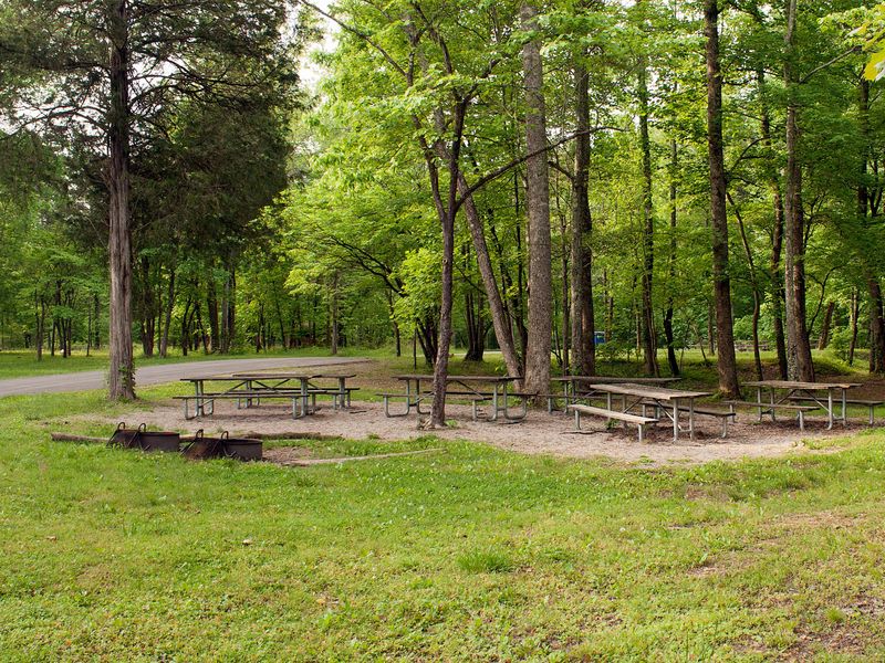 Maple Springs Group Campground offers a peaceful, remote camping experience on the north side of Mammoth Cave National Park, located six miles from the visitor center and three miles north of Green River Ferry. This group campground is specifically designed for larger camping parties and equestrian groups, with seven sites that can accommodate up to 24 people each. Sites 1 through 4 are designated equestrian sites featuring horse tie-up areas and can accommodate up to 8 horses per site, while sites 5, 6, and 7 are standard group sites. All sites include electric and water hookups suitable for RVs up to 40 feet and trailers up to 26 feet. Each site features one fire ring and one picnic table, with paved, level parking areas. A small amphitheater and large communal fire pit are available on a first-come, first-served basis. The campground offers vault toilets and seasonal potable water, with trash collection provided. Note that there is no sewer hookup or dump station at this location. The campground is accessed most quickly via the Green River Ferry, which operates Monday through Friday from 6:00 a.m. to 4:00 p.m. and weekends from 8:00 a.m. to 4:00 p.m. Central Time. The ferry accommodates vehicles up to 16 feet long and 8 tons, meaning most RVs must take the alternate 45-minute route through Brownsville. Maple Springs serves as an ideal base for exploring the park's extensive backcountry trail system, with more than 70 miles of trails open to both horses and hikers. The location also provides easy access to Mammoth Cave tours and other park attractions.