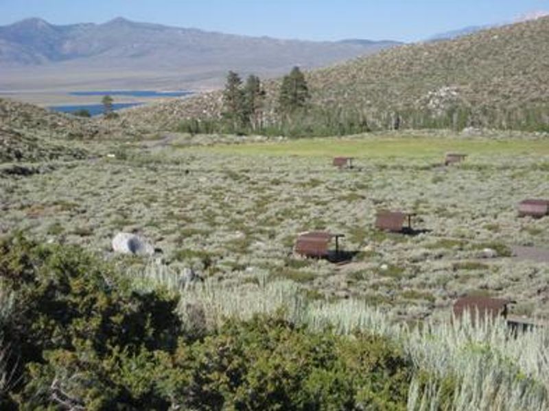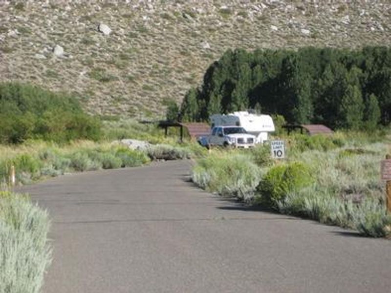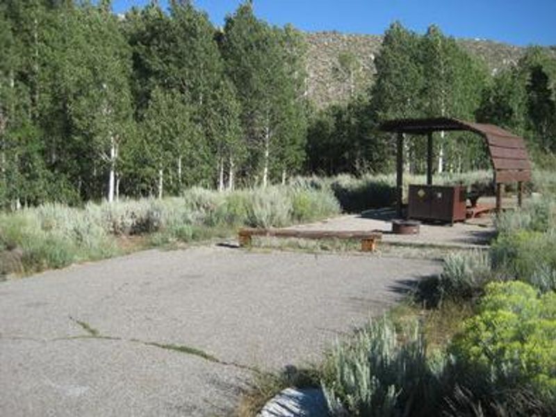 McGee Creek Campground provides a pleasant, sunny camping location between Bishop and Mammoth Lakes in the eastern Sierra Nevada Mountains. The campground sits at an elevation of 7,600 feet in an expanse of silvery white sagebrush near a meadow lined with aspens, offering outstanding views of high mountain peaks in the John Muir Wilderness. McGee Creek runs alongside the campground, with some sites situated along the banks. The campground features 28 reservable, open and sunny campsites, each equipped with a picnic shelter to provide shade in this relatively treeless environment. All roads and camping spurs are paved, making access straightforward. Bear-proof lockers are provided at each site for food storage, and firewood is available for sale on-site. Vault toilets and drinking water from faucets are available. The location's proximity to U.S. Highway 395 and the adjacent John Muir Wilderness makes it a hot spot for outdoor recreation. The McGee Creek Trailhead, just 2 miles from the campground, provides access to the McGee Canyon area of the John Muir Wilderness for hiking and horseback riding. The eastern Sierras are known for exceptional trout fishing, and both McGee Creek and nearby Crowley Lake (4 miles away) offer excellent fishing opportunities. The area's interesting geology also attracts rock hounds. The campground typically operates seasonally from May through September.