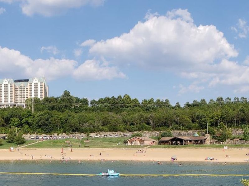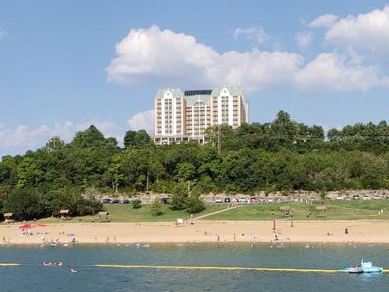 Moonshine Beach Recreation Area is a very popular sandy swimming beach along the shores of Table Rock Lake, just north of Table Rock Dam near Branson, Missouri. Unlike smaller swimming areas at campgrounds surrounding Table Rock Lake, Moonshine Beach is spacious enough to make visitors feel like they're at the ocean rather than a lake. This day-use recreation area offers picnicking, swimming, scuba diving, boating, fishing, hiking, and wildlife viewing. The beach features flush toilets, showers, a large group picnic shelter that accommodates up to 75 guests, volleyball court, and a boat ramp. The adjacent Dewey Short Visitor Center offers the 2-mile Table Rock Lakeshore Trail, which runs to the Table Rock State Park Marina and showcases spring blooms of dogwood, serviceberry, and redbud trees, along with beautiful views of the lake. Table Rock Lake is a beautiful body of water surrounded by oak and hickory forests, with its waters winding through the valleys and hollows of the Ozark Mountains. Originally built for flood control, Table Rock Dam created a lake with 779 miles of shoreline that attracts more than five million visitors annually.