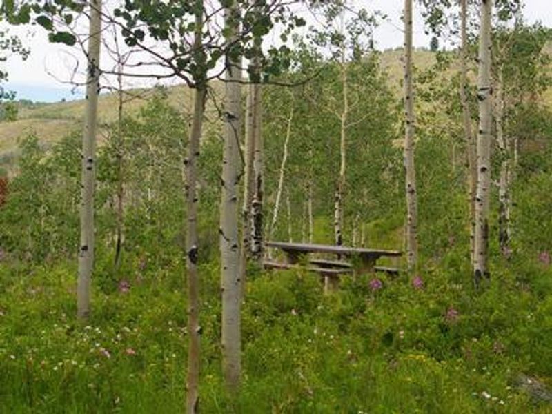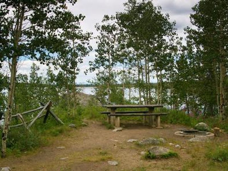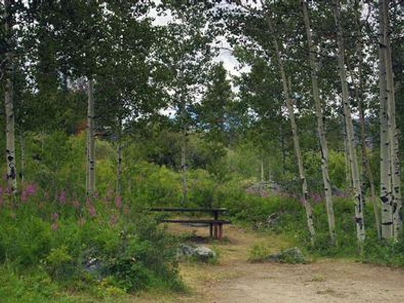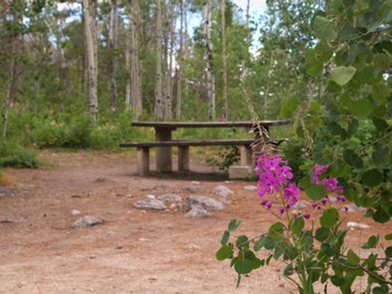 Narrows Campground is situated above scenic New Fork Lake at the edge of the Wind River Range in northwestern Wyoming. The campground sits in a dense grove of aspens at 7,800 feet elevation, with shade plentiful throughout and most sites affording scenic lake views. Summer wildflowers vividly carpet the area. The campground contains 19 single-family campsites, each with picnic tables and campfire rings. Two vault toilets are conveniently located throughout the campground. A campground host is on-site during the operating season. Roads and parking spurs are native soil, and turnarounds are narrow, making oversized vehicles and trailers not recommended. New Fork Lake offers excellent boating, canoeing, swimming, and fishing for kokanee salmon, brook, lake, and rainbow trout. A large cement boat ramp is located less than one mile from the campground. The New Fork Trail begins at the campground entrance and provides backcountry access through New Fork Canyon into the Bridger Wilderness, connecting with several other trails. Horse corrals are located at the trailhead, though livestock is not allowed within the campground itself. Pinedale, the nearest full-service community, is 26 miles away.