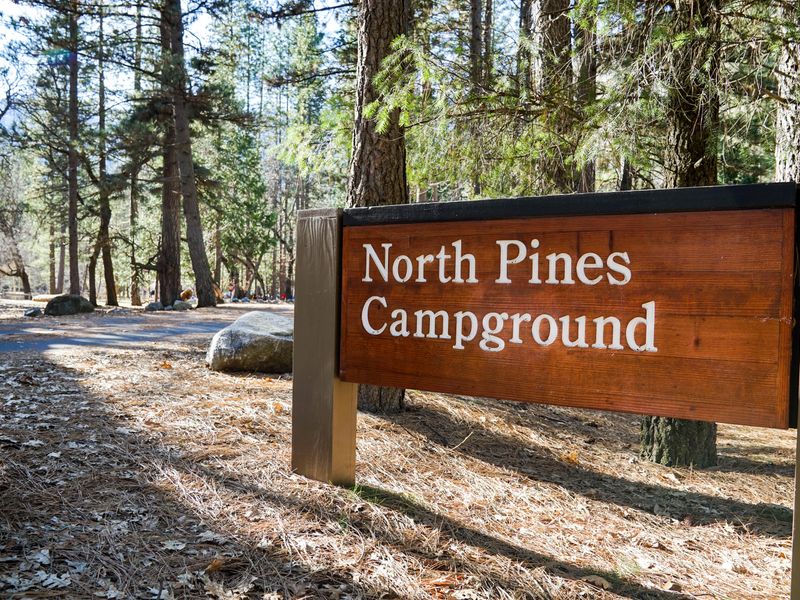 North Pines Campground is one of three reservation campgrounds in Yosemite Valley, situated along the Merced River at 4,000 feet elevation in California's Sierra Nevada. The campground features 80 sites nestled among a diverse forest of California black oak, Ponderosa pine, Incense-cedar, White fir, and Whiteleaf Manzanita, offering a pleasant mix of sun and shade with views of Yosemite's iconic granite cliffs. The campground provides paved roads and parking spurs, flush toilets, drinking water, and is serviced by Yosemite's free shuttle bus. Each campsite includes a picnic table, fire ring, and bear-proof food storage locker. Nearby Curry Village offers fee-based showers, a general store, restaurants, and activity services. The location is ideal for accessing Yosemite Valley's world-class hiking trails, including the easy two-mile walk to Mirror Lake and the challenging Half Dome trek. Sites accommodate RVs up to 40 feet and trailers up to 35 feet, though not all sites can handle maximum lengths. No hookups are available, but a free dump station is located at nearby Upper Pines.