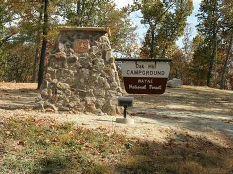 Oak Hill Campground is a recently renovated camping facility within Lake Vesuvius Recreation Area in Wayne National Forest's Ironton Unit. The campground offers 27 fully accessible RV sites with water and electric hookups, organized into four loops: Pine Knob, White Oak, Post Oak, and Scarlet Oak. Modern amenities include two flush restrooms with showers and one vault restroom. The campground is situated on a ridge on the west side of the 143-acre Lake Vesuvius, surrounded by mixed hardwood-pine forest with mature oak trees. More than 40 miles of trails exist in the area, with multiple hiking trails connecting directly to the campground. The Rock House, Black Oak, Old Beach, and Scarlet Oak Trails form a 1.5-mile loop with a 200-foot elevation change. A spur trail connects to the Rock House Trail, which leads to a cave historically used by Native Americans. Lake Vesuvius provides opportunities for boating, fishing, and swimming, with anglers catching bass, catfish, crappie, and bluegill. Half of the campsites are reservable through Recreation.gov, while the remaining sites operate on a first-come, first-served basis.