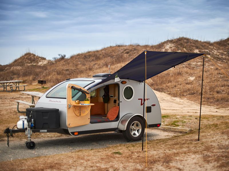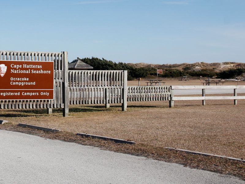 Located in the famous Outer Banks area along Cape Hatteras National Seashore, Ocracoke Campground offers a secluded beach camping experience on a barrier island accessible only by ferry or aircraft. The campground features 136 sites situated on sandy soil behind barrier dunes that separate campers from the stunning Atlantic coastline. Campsites accommodate tents and RVs up to 40 feet in length, with each site providing a paved parking pad, picnic table, and charcoal grill. The campground offers flush toilets, potable water, and free cold showers year-round. There are no hookups or shade trees at this exposed beachfront location. Campers should bring extra-long tent stakes due to sandy soil and insect repellent during summer months when mosquitoes are prevalent. The seashore provides opportunities for swimming, fishing, clamming, kayaking, windsurfing, and wildlife viewing. Nearby Ocracoke Village, located three miles west, offers restaurants, gift shops, grocery stores, and a gas station. The campground is open year-round with reservations available up to six months in advance through Recreation.gov. Between Memorial Day and Labor Day, camping is limited to 14 consecutive days.
