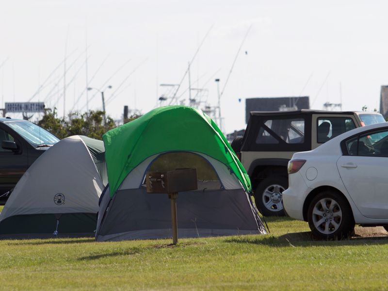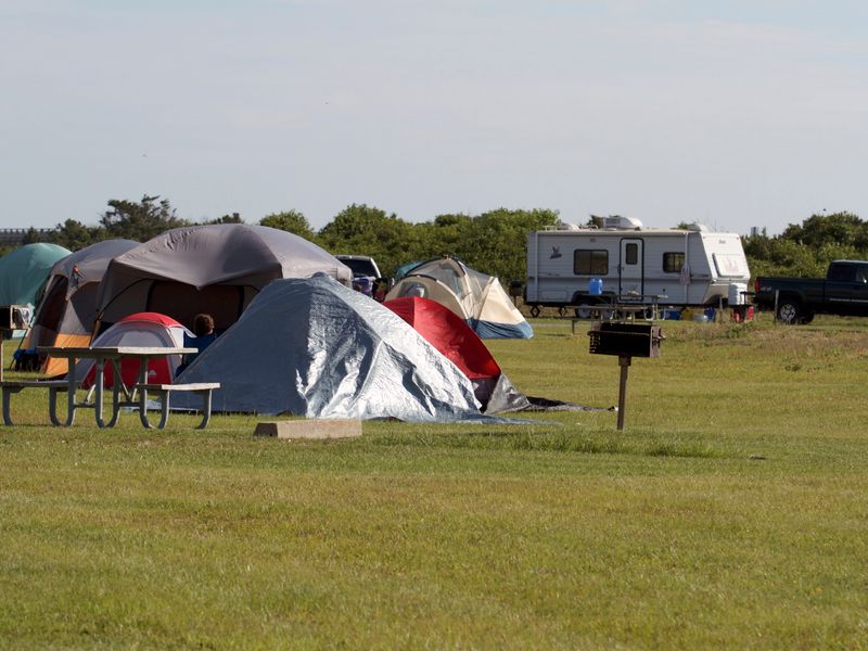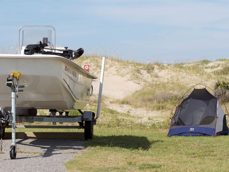 Oregon Inlet Campground is Cape Hatteras National Seashore's northernmost campground, providing barrier island camping within easy distance of Nags Head to the north and world-class fishing at Oregon Inlet to the south. The campground features 107 sites, including 23 with electric and sewer hookups for RVs. All sites include paved parking pads, picnic tables, and charcoal grills on sandy, unshaded terrain. Located on the east side of the barrier island, campsites offer a short walk through Sea Oats-covered dunes to the expansive Atlantic Ocean. The beach is accessible on foot or by vehicle with a Cape Hatteras Off-Road Vehicle Permit. Popular activities include fishing, swimming, surfing, birding, and shell hunting. Sound-side opportunities are available at the Oregon Inlet Fishing Center boat launch across Highway 12, including crabbing, clamming, paddle-boarding, boating, and fishing. The campground operates year-round with flush toilets available throughout. Hot showers are available seasonally. A dump and water fill station are located across Highway 12 at Oregon Inlet Fishing Center at no charge for campers. The campground accommodates RVs and trailers up to 40 feet with back-in parking. Oregon Inlet is the only Cape Hatteras National Seashore campground offering group camping for 7-30 people. Nearby attractions include the historic Bodie Island Lighthouse and Coquina Beach Day Use Area.
