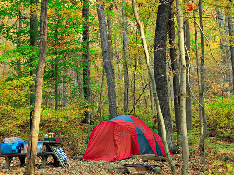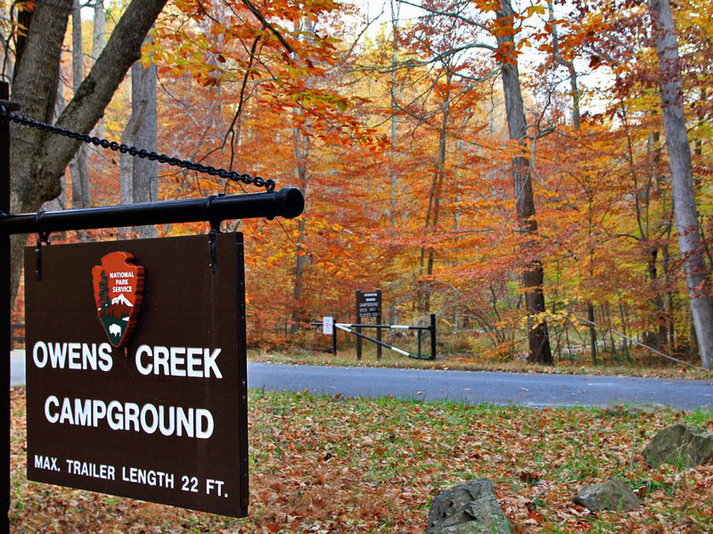 Owens Creek Campground provides primitive camping in a scenic wooded setting within Catoctin Mountain Park, just five miles from Thurmont, Maryland. The campground features 50 non-hookup sites limited to five people or immediate family per site, with three ADA-accessible sites available. Maximum trailer length is 22 feet and maximum RV length is 30 feet, with three pull-through sites (12, 39, and 43) available. Each site is equipped with a tent pad (minimum 12' x 12'), picnic table, and fire ring, with all tents required to fit on the designated pad. The campground surrounds visitors with a rolling landscape perfect for hiking, with Owens Creek flowing past to create a peaceful natural setting. Flush toilets, hot showers, and drinking water are centrally located within the campground. The Deerfield Nature Trail connects directly from the campground as a 1.5-mile loop linking to the park's western trail system, while the nearby Browns Farm Trail in Owens Creek Picnic Area offers historical interpretation. Catoctin Mountain Park's 25 miles of trails range from easy to strenuous, providing extensive hiking opportunities through forests that display seasonal beauty from spring wildflowers to fall foliage.