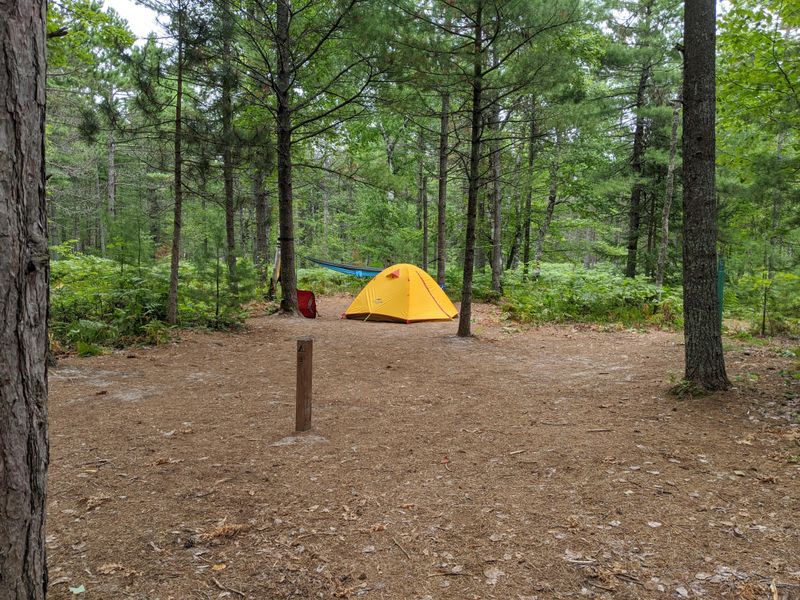 Access the Pine Bluff Individual Backpacking Sites via the North Country Trail within Pictured Rocks National Lakeshore. The sites are situated on a sandy bluff above Lake Superior, just off the trail.