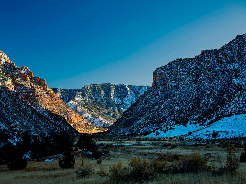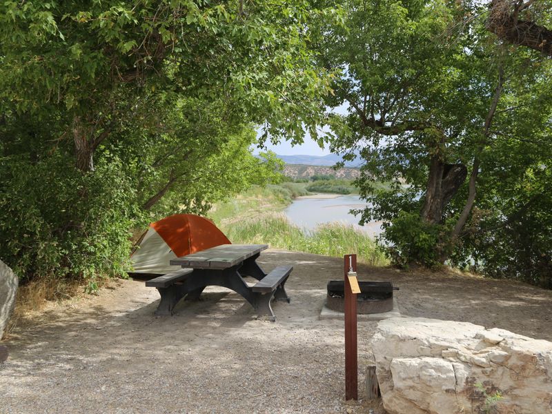 Rainbow Park Campground is a remote, primitive camping area located on the Green River at the head of Split Mountain Canyon in the Utah portion of Dinosaur National Monument. The campground sits 28 miles from the Quarry Visitor Center and is accessed via a challenging dirt road that demands high-clearance vehicles and becomes completely impassable when wet. The four first-come, first-served sites provide a rugged camping experience with basic amenities including vault toilets, fire grates, and picnic tables. No water is available, so campers must bring all water needed for drinking, cooking, and washing. The campground is situated near the Rainbow Park boat ramp, a popular put-in point for whitewater rafting trips through Split Mountain Canyon on the Green River. Visitors are rewarded with spectacular views of the surrounding geology, including the prominent Mitten Park Fault. The campground can accommodate small RVs and truck-top campers up to 15 feet, though the rough access road limits practical use to high-clearance vehicles and experienced backcountry travelers. While open year-round, winter access is particularly challenging as the unpaved road receives no winter maintenance.