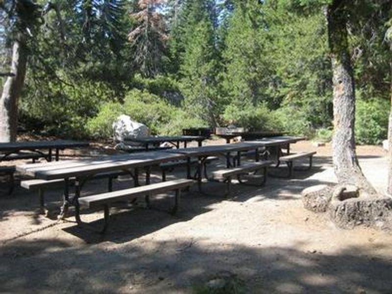 Red Fir Group Campground provides a primitive group camping experience in the lush Eldorado National Forest, situated on the north shore of Loon Lake Reservoir at 6,400 feet elevation. This tent-only campground is part of the Crystal Basin Recreation Area and nestled in a forest of tall pine trees. The campground accommodates groups of up to 25 people and features a group kitchen area equipped with multiple tables, a campfire circle, and grills. Accessible vault toilets and drinking water are provided. RVs are not permitted at this site. The campground is just a short walk across the road to Loon Lake's water's edge, where visitors enjoy fishing, swimming, and boating. The area offers access to the popular Rubicon Jeep trail for off-road vehicle and motorcycle enthusiasts. Hiking and wilderness backpacking are popular activities, with the Loon Lake trailhead nearby providing access to the Desolation Wilderness. Bears frequent the area, so all food must be kept in approved containers. Forest orders limit camping to a combined total of 14 days per calendar year forest-wide.