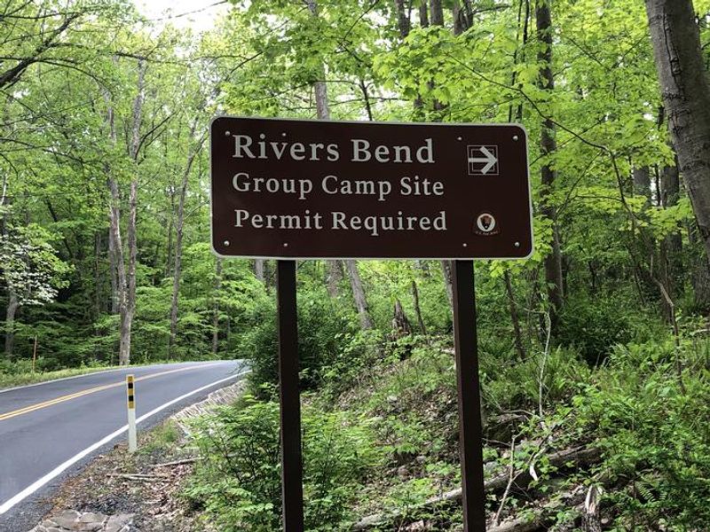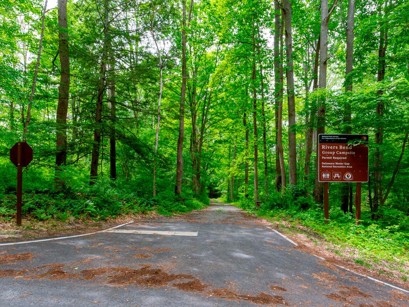 Rivers Bend Group Campground is located on Old Mine Road on the New Jersey side of Delaware Water Gap National Recreation Area, offering a peaceful setting close to Big Flatbrook Creek and the Delaware River. The campground features five primitive group sites in an open grassy field area surrounded by sprawling pines and hardwood trees, with each site accommodating 5-15 people. Each group site is equipped with a fire ring, picnic table, bear-proof trash containers, and food lockers. Vault toilets are centrally located, and potable water is available seasonally. Facilities are ADA accessible. The campground offers dual access: campers can drive in via a compacted gravel entrance road with parking for up to six vehicles per site, or paddle in from the Delaware River via a crushed gravel trail approximately 1/10 mile to the campsites. The location provides excellent access to outdoor recreation including paddling on the Delaware River, hiking nearby sections of the Appalachian Trail, exploring historic Millbrook Village, and accessing swimming beaches along the river. The campground sits within easy reach of Mount Tammany and Mount Minsi hiking trails at the southern end of the recreation area. Firewood collection is permitted from dead and downed wood within 100 yards of the campground, but bringing firewood from outside the park is prohibited due to invasive species concerns.
