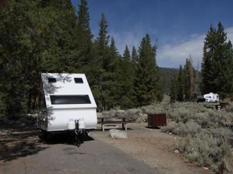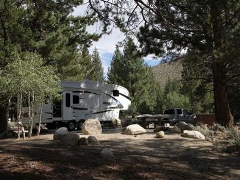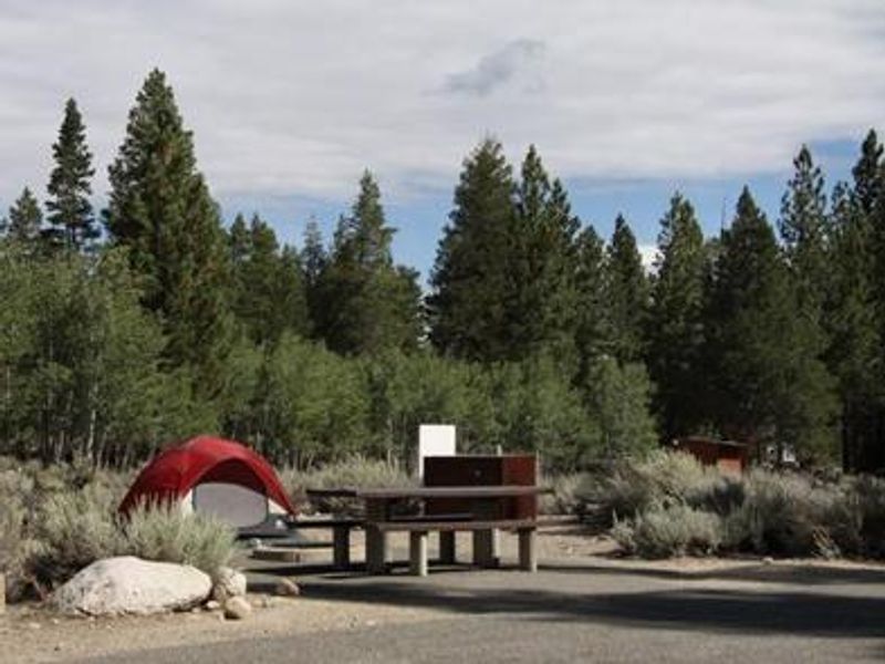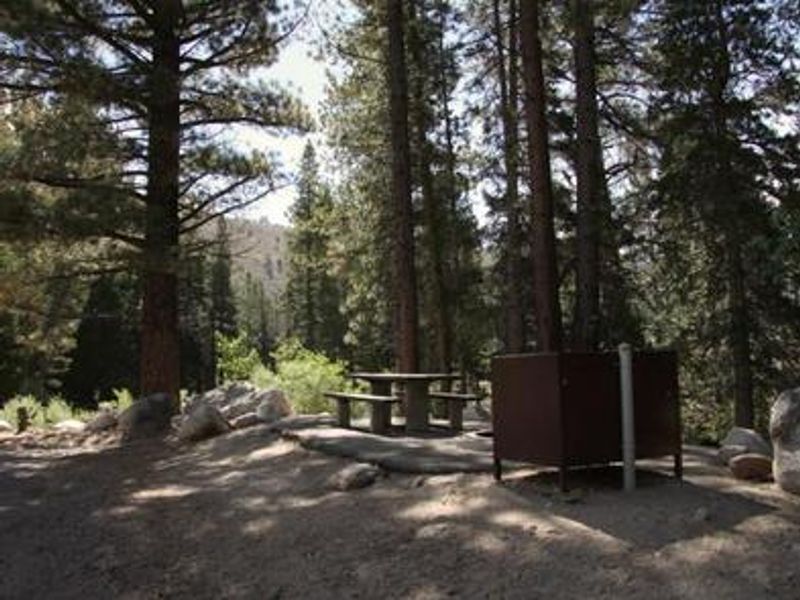 Robinson Creek South Campground is situated along its namesake creek in the Humboldt-Toiyabe National Forest, just 9 miles from Bridgeport, California. At an elevation of 7,000 feet, the campground is shaded by a forest of massive Jeffrey pines, with lodgepole pines, sagebrush, and summer wildflowers dotting the landscape. The 25-site campground offers a mix of standard, RV, tent-only, and walk-to sites, all with picnic tables, food storage lockers, and campfire rings with grills. Robinson Creek provides excellent rainbow trout fishing opportunities accessible directly from the campground. The popular Robinson Creek Trail and numerous other hiking trails are in the vicinity, with the rugged Hoover Wilderness Area accessible from the nearby Twin Lakes area. Upper and Lower Twin Lakes offer boating, canoeing, and fishing for Kokanee salmon, rainbow trout, and brown trout. Educational programs are held at the campground's amphitheater on weekends from July 4 through Labor Day. Black bears frequent the area, and all food must be stored in provided lockers.