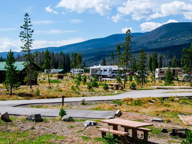 Timber Creek Campground is the only campground on the west side of Rocky Mountain National Park, located eight miles north of the Grand Lake Entrance along Trail Ridge Road at an elevation of 8,900 feet. The campground contains 98 sites, including standard nonelectric sites and walk-to sites, all available by reservation only through Recreation.gov. Sites accommodate RVs and trailers up to 30 feet in total combined length. The campground has been impacted by mountain pine beetle infestation and wildfire, which killed many trees and resulted in minimal shade throughout the campground. However, this creates opportunities to see forest regrowth with wildflowers filling surrounding meadows in June and July. The area features a mix of Douglas fir, lodgepole pine, and ponderosa pine. Wildlife is abundant, with mule deer and Rocky Mountain elk commonly seen, and occasional sightings of black bear, coyote, bighorn sheep, and moose. Each campsite is equipped with a picnic table, fire ring with grate, and tent pad. During the summer season, potable water is available throughout the campground along with dish sinks, a water fill station, and a dump station. Food storage lockers are provided throughout the campground to protect against bears and other wildlife. The campground offers access to over 350 miles of hiking trails in Rocky Mountain National Park, including the Colorado River Trail, Coyote Valley Trail, and Green Mountain Trail. The historic Holzwarth Historic Site is located nearby. The town of Grand Lake, with dining and shopping, is 10 miles south of the campground.
