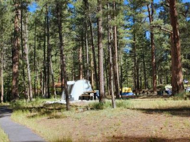 San Antonio Campground is nestled along the San Antonio River in the Santa Fe National Forest at 7,600 feet elevation, surrounded by towering ponderosa pines and open forest meadows. This popular campground was completely rebuilt and reopened in August 2010 as a designated reduced-impact and recycle campground. The facility offers 20 single-family sites, with six sites featuring electric and water hookups suitable for trailers and RVs up to 35 feet. A paved walking trail runs alongside the river, providing excellent access for fishing rainbow trout, wildlife viewing, and wading on hot summer days. The campground serves as an ideal base for exploring the Jemez National Recreation Area. Visitors have easy driving access to several popular recreational sites including La Cueva Picnic Site, Spence Hot Spring Trailhead, Battleship Rock Trailhead, and multiple fishing sites along the San Antonio River. The area features some of the finest mountain scenery in the Southwest, with the diverse ecosystems providing habitat for Jemez Mountain salamanders, northern goshawks, Merriam's turkeys, and Abert's squirrels. The 163-mile Jemez Mountain Trail Scenic Byway passes through the area, showcasing amazing geological formations, ancient Indian ruins, and rich logging, mining, and ranching heritage. Visitors should come prepared for warm summer days and cool nights at this elevation.