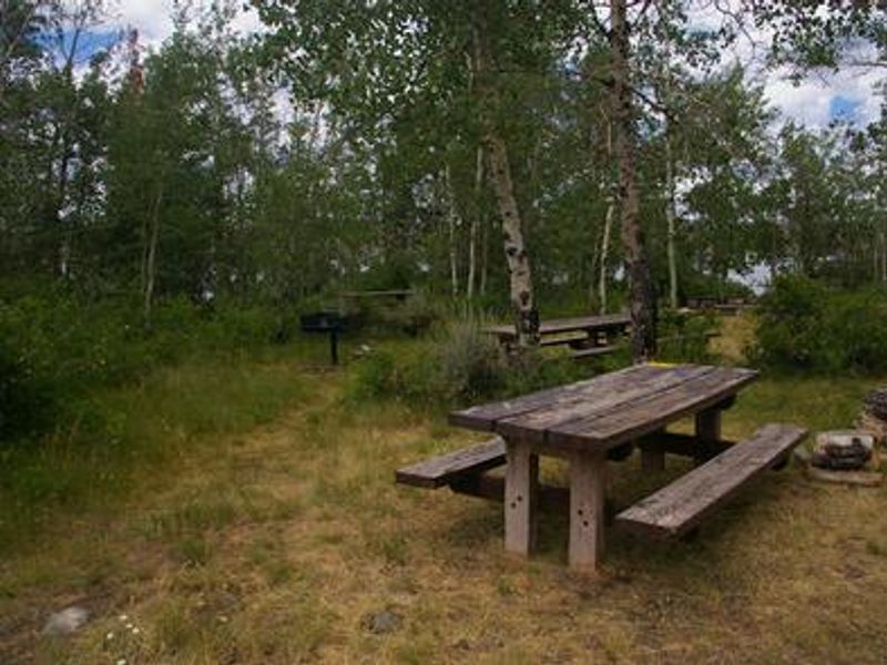 Sandy Beach Picnic Area sits on the southeast shores of Fremont Lake, Wyoming's second largest natural lake, just 3 miles northeast of Pinedale. At an elevation of 7,400 feet, this day-use facility offers a single group picnic site that can accommodate up to 75 guests. The area features picnic tables, grills, fire rings with benches, and vault toilets. A private sandy swimming beach provides direct lake access, while a boat ramp and dock just outside the site support various water activities. Fremont Lake stretches along the foot of the rugged Wind River Range, offering sweeping views of craggy granite peaks and pristine alpine waters. The picnic area is shaded by thin stands of aspen trees. The lake is popular for fishing rainbow, brown and lake trout, plus kokanee salmon, as well as boating, sailing, canoeing, kayaking and swimming. Roads and parking spurs are unpaved dirt surfaces.