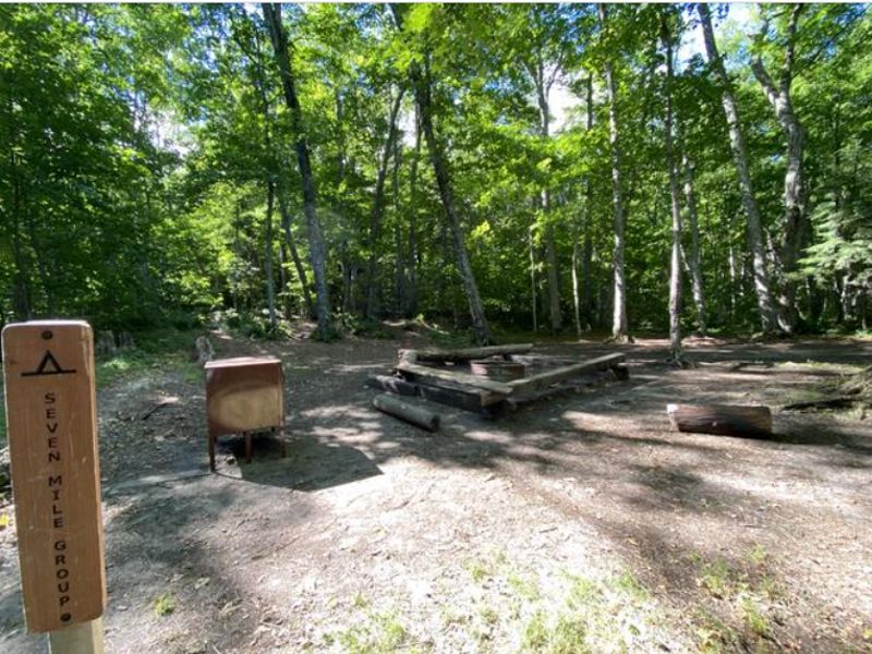 Access the Sevenmile Creek Group Backpacking Site via the North Country Trail. From the trailhead, cross the footbridge over Sevenmile Creek and continue through the woods until the site opens up near Lake Superior.