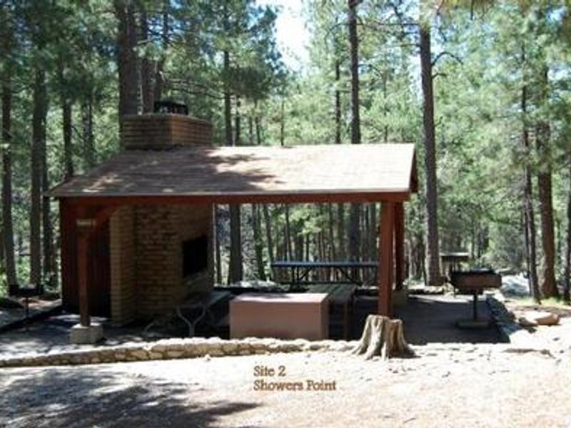 Showers Point Group Campground is a tent-only facility at 7,700 feet elevation on the slopes of the Santa Catalina Mountains. The campground features three well-separated group sites, each accommodating up to 25 people, nestled in the cool shade of tall ponderosa pines and clusters of Gambel oak. Each site includes a ramada, picnic tables, large firepits, BBQ grills, and a 120-volt outlet for small appliances. The campground's elevated location provides dramatically cooler temperatures than lower-elevation areas and features one of the most scenic overlooks in the Santa Catalinas within easy walking distance. From this bluff, visitors can view the lower slopes of the Santa Catalina Range and the Santa Cruz Valley stretching toward Mexico, with pyramid-shaped Mt. Wrightson of the Santa Rita Mountains prominent on the horizon. The Palisade Trail departs from a nearby trailhead, descending the southwestern slopes to Sabino Canyon Recreation Area. Fishing is available at the nearby six-acre Rose Canyon Lake. Access is via Catalina Highway (also known as General Hitchcock Highway or Sky Island Scenic Byway), approximately 30 miles northeast from Tucson. The campground is managed by a concessionaire and includes centrally located restrooms, potable water faucets, and an on-site host.