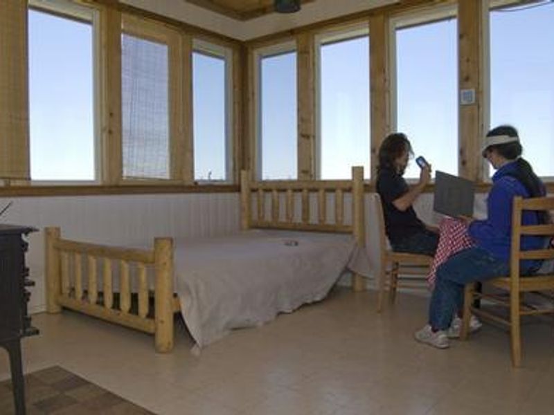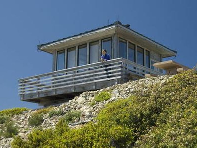 Snow Camp Lookout sits at the peak of Snow Camp Mountain at an elevation of 4,223 feet in the Rogue River-Siskiyou National Forest, offering guests spectacular panoramic views of the surrounding area. On clear days, visitors can see ocean waves crashing along Kellogg Beach, Point St. George, and Castle Rock near Crescent City, California. The fire lookout is the most recent of three structures built atop Snow Camp Mountain. The site has served as a fire lookout since about 1910 and was used as an Aircraft Warning System station during World War II. The 15' x 15' Standard R-6 Flat style lookout cabin constructed in 1958 was destroyed in the 2002 Biscuit Fire, a massive blaze that burned more than a half-million acres in Oregon and California. Thanks to the generous efforts of Don Hartley and volunteers, the lookout was reconstructed and reopened in 2004. The renovated lookout is furnished with a double bed with mattress, table and chairs, cabinets and counter space, a wood-burning cook stove, and an outdoor picnic table. A pit toilet is located nearby. The lookout offers access to an extensive historic trail system, including the Snow Camp Trail, one of the oldest trails in the forest that follows aboriginal travel routes and provides access to Windy Valley, a pristine mountain meadow with a crystal clear creek. The location is ideal for hiking, mountain biking, stargazing, and wildlife viewing. Although visitors can drive to within 200 yards of the lookout, the final approach requires carrying gear up a strenuous slope to the summit.