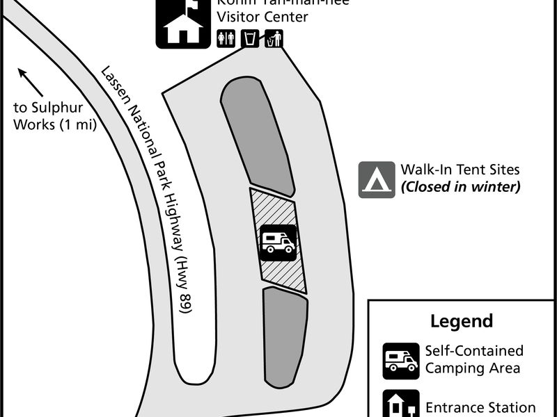 The Southwest Parking Area Self-Contained Camping provides year-round overnight accommodations in the center section of the Kohm Yah-mah-nee Visitor Center parking lot. This facility operates even when the adjacent Southwest Walk-in Campground is closed due to snow, typically from November through May. The parking area is located at 6,700 feet elevation in the southwest corner of Lassen Volcanic National Park along Highway 89, approximately one mile from the southwest entrance station. Only self-contained vehicles such as motorhomes, campers, and trailers are permitted. Tents, fires, fire pans, and portable gas fire pits are prohibited in the parking area. Self-contained barbecues and gas stoves are allowed. Campers must park in designated spaces between the medians and occupy only one parking space to allow for traffic flow and snow-plowing operations. Vehicles extending beyond parking space width and blocking traffic flow are not permitted. The facility offers 5 to 15 parking spaces available on a first-come, first-served basis. Payment is made through Recreation.gov's Scan & Pay mobile app at $10 per night. The location provides access to flush toilets and potable water year-round at the visitor center, though some facilities may be seasonally limited. All parking spaces are paved and flat with ADA-accessible sidewalks. Maximum RV and trailer length is 36 feet.