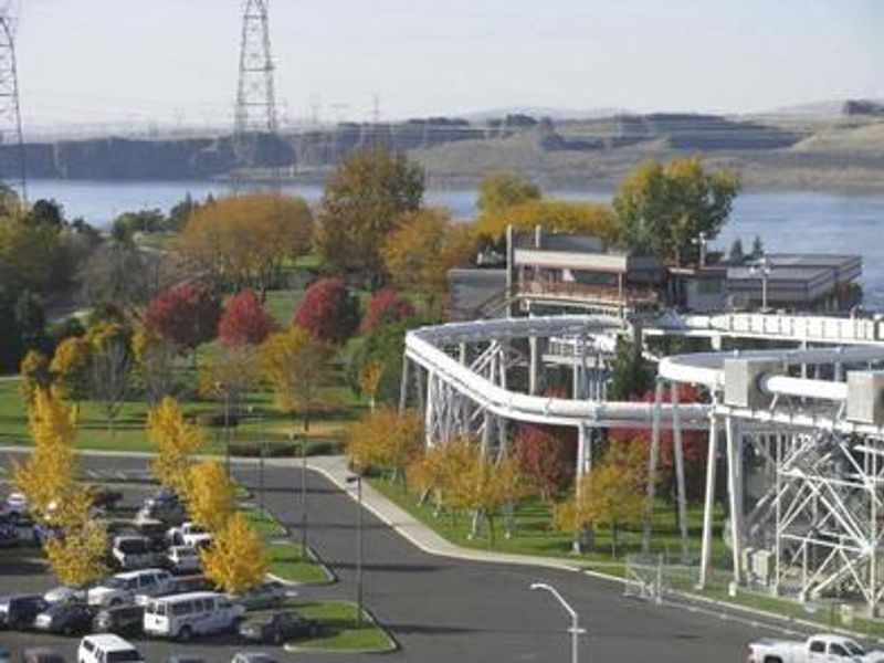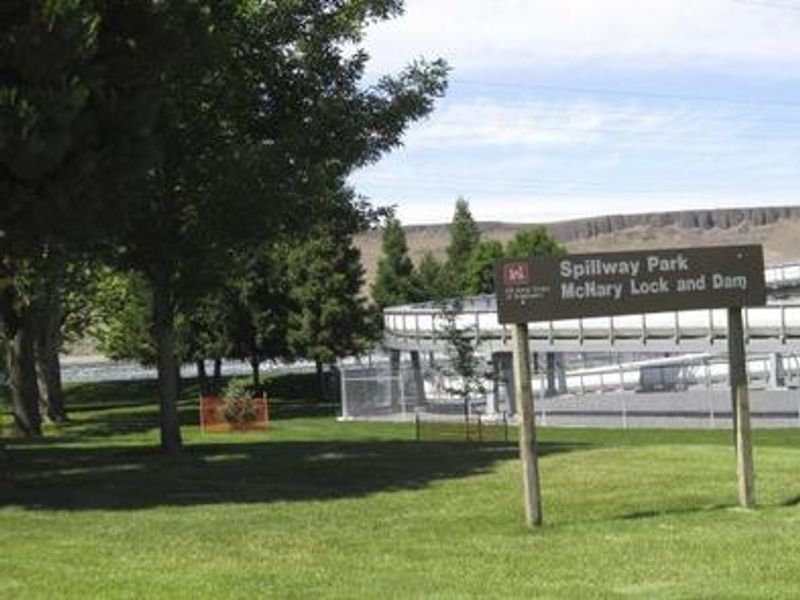 Spillway Park Chinook Shelter is a day-use group shelter facility operated by the U.S. Army Corps of Engineers on Lake Umatilla in eastern Oregon. Located along the Columbia River just downstream of McNary Lock and Dam, the shelter provides a covered gathering space for groups with eight picnic tables, two fire grills, and electrical hookups. The park is situated on the bank of the Columbia River and offers relaxing shade with beautiful views of McNary Dam. Visitors can enjoy two overlooks to watch dam operations, a volleyball court, and access to the McNary Dam Wildlife Area trail system. The location provides an ideal setting for group picnics and gatherings while exploring the Mid-Columbia River region. Nearby attractions include the Pacific Salmon Visitor Center, Oregon Fish Viewing Room, and the McNary Dam Wildlife Area with its natural trails. The park is accessible from Highway 730 via Devore Road, with the shelter located within Spillway Park after passing the main dam parking area.