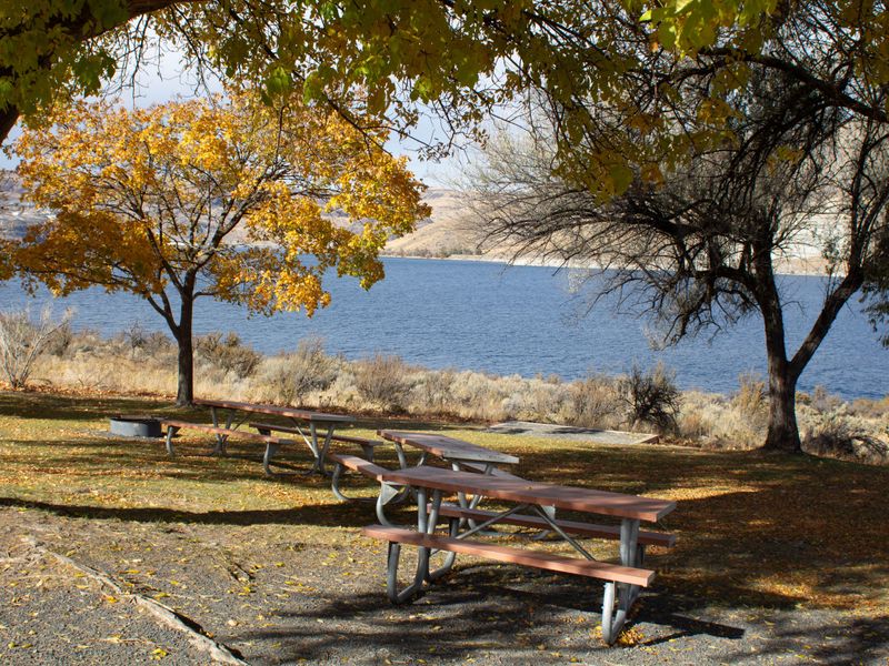 Spring Canyon Group Site is perfect for large families and groups of boaters or fishermen seeking a lakefront camping experience. Located within the Spring Canyon Campground on the shoreline of Lake Roosevelt, this facility offers two group sites that can each accommodate up to 25 people. One site is located directly on the waterfront, while the other sits within a short walk of the lake with beautiful water views. The 130-mile long Lake Roosevelt is a feature of the Columbia River created by the Grand Coulee Dam. The area provides ample opportunity for boating, fishing, and water sports, with a boat ramp and docks within the facility providing easy access to the water. Families can cool off in the day-use swimming area located approximately 300 yards downhill from the campground, which also features a playground. The lake area has abundant wildlife and birds, including eagles and osprey, with dozens of fish species inhabiting the water. The campground sits in an open desert landscape, meaning little shade and extremely hot temperatures in the summer, with highs averaging in the 90s and over 100 degrees. The group sites are reservable from March through November. The famous Grand Coulee Dam is only three miles away, offering a nightly laser light show from Memorial Day weekend through September 30. For those looking to take a break from the lake, the Bunchgrass Prairie Nature Trail offers a short walk through the sagebrush.