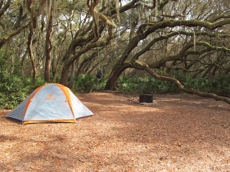 Stafford Beach Campground is a backcountry campground located on Cumberland Island National Seashore, accessible only by ferry or private boat. After arriving at the Sea Camp dock, campers must hike 3.5 miles north via the Parallel Trail or Main Road to reach the campground, carrying all gear without the use of carts or wheeled coolers. The campground features 10 designated tent sites, each equipped with a fire ring and grill. Modern amenities include flush toilets, cold showers year-round, and potable water spigots. Food storage lockers are provided to protect supplies from raccoons and other wildlife. Sites accommodate up to 6 people and are available for $12 per night. The campground sits in a maritime forest of live oaks draped with Spanish moss, with beach access nearby. Visitors can explore over 50 miles of trails and roads across the 18-mile-long island. The island is home to wild horses, deer, turkey, alligators, and numerous bird species. No stores or services exist on the island beyond water and restroom facilities. Reservations can be made up to 6 months in advance through Recreation.gov and are required for all camping.