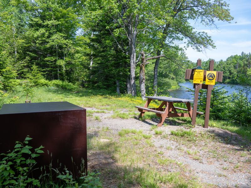 Stair Falls Campsite is a remote primitive campsite located along the East Branch of the Penobscot River within Katahdin Woods and Waters National Monument. This backcountry site can be accessed via a 2-mile hike or bike ride from Haskell Gate at the north entrance, or by paddling down the East Branch Penobscot River. The site features basic amenities including a picnic table, bear-proof food storage locker, and designated fire pit. The campsite is positioned at the portage trail for Stair Falls, making it an ideal spot for paddlers navigating this section of the river. Campers must be self-sufficient as there are no water sources or toilet facilities on site. All trash must be packed out following Leave No Trace principles. Campfires require a free Maine Forest Service campfire permit, easily obtained by contacting the Northern Region Headquarters in Ashland. This single-site campground offers a true backcountry experience in the heart of Maine's North Woods. The surrounding area provides opportunities for wildlife viewing, fishing, and exploring the monument's rugged landscape. Vehicles are not permitted at the campsite, ensuring a quiet, wilderness setting for tent camping only.