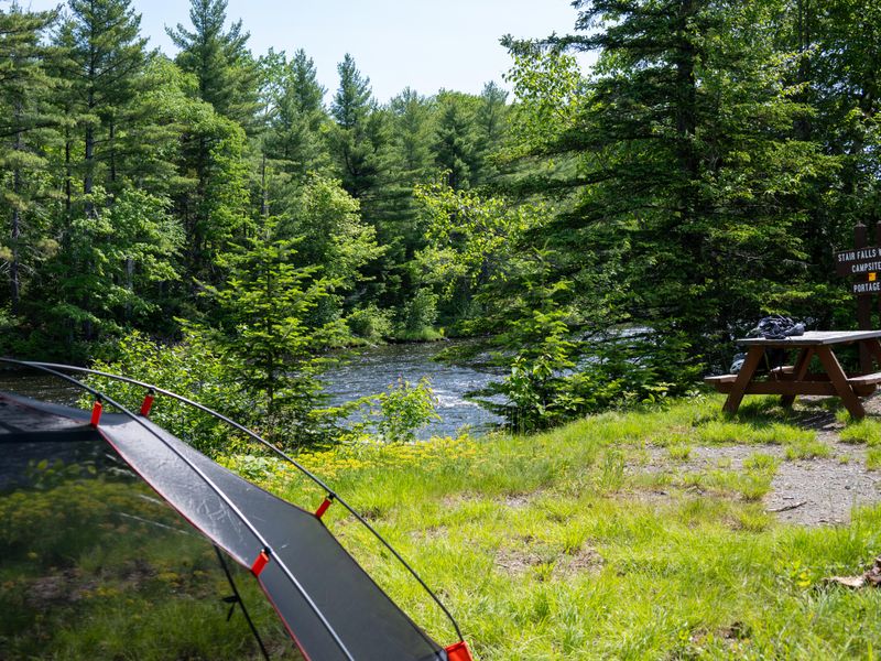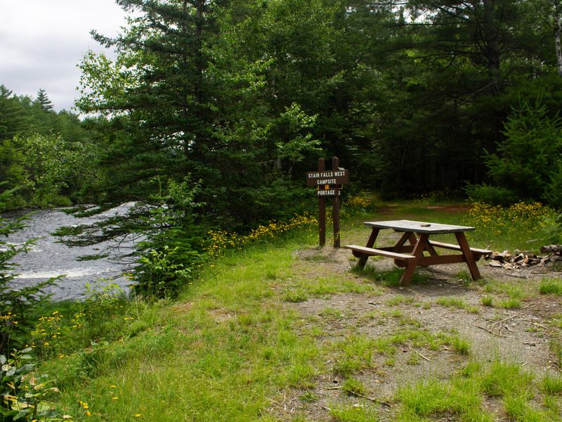 From the north entrance to Katahdin Woods and Waters National Monument, drive approximately 4.4 miles to Haskell Gate. From Haskell Gate, hike or bike 2 miles to reach Stair Falls Campsite. Alternatively, access by paddling the East Branch Penobscot River.
