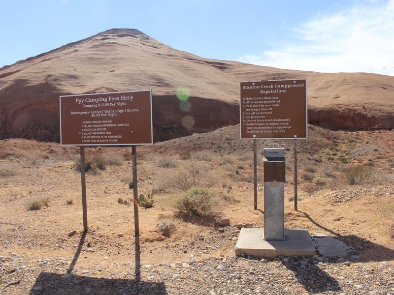 Open — Open year-round, first-come first-served only. No reservations accepted. Fee is $12 per night, payable at Bullfrog Entrance Station or iron post at entrance.