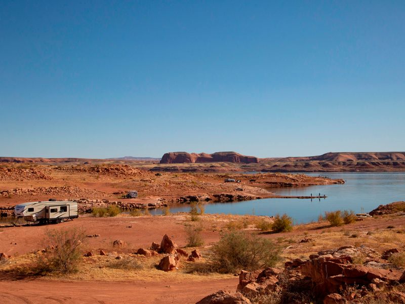 Stanton Creek Primitive Camping Area is a designated dispersed camping zone within Glen Canyon National Recreation Area, located just north of Bullfrog Marina along Highway 276. This expansive primitive area consists of open terrain with dirt and brush, with some portions adjacent to Lake Powell's shoreline. Unlike traditional campgrounds, there are no designated campsites; visitors simply choose their spot within the allowed area. The area is accessible by vehicle, though road conditions can vary and some portions may require 4-wheel drive. There are no facilities or services at Stanton Creek: no potable water, no toilets, and no hookups. When pit toilets are unavailable, campers must bring portable toilets and properly dispose of waste in a sewer system. No glass containers are permitted, and fires must be contained to a four-foot by four-foot area and can only be lit below the high water mark. Camping operates on a first-come, first-served basis with no reservations. The fee is $12 per night, payable at the Bullfrog Entrance Station by card or at the iron post at the beach entrance with cash. Quiet hours are observed from 10 PM to 6 AM. Summer temperatures can reach 110°F with little shade, while winter nights often drop below freezing. Spring brings variable weather and strong winds, while fall offers mild conditions ideal for camping.