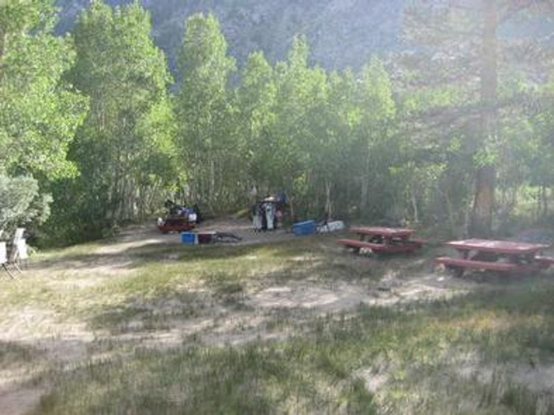 Table Mountain Group Campground sits along the South Fork of Bishop Creek in Inyo National Forest, 18 miles southwest of Bishop. At 8,500 feet elevation, this walk-in tent campground is nestled among aspen and Jeffrey pine trees, offering a streamside setting ideal for group camping. The site accommodates up to 25 people and requires advance reservations through Recreation.gov. The campground provides vault toilets, bear-proof food storage boxes, picnic tables, and campfire rings. Campers must bring their own drinking water as none is available on-site. The location serves as an excellent base for fishing Bishop Creek's trout-stocked waters and accessing wilderness trails. Less than a mile up the road, the Tyee Lakes Trail climbs Table Mountain with views of the Inconsolable Range and peaks surrounding South Lake. Nearby attractions include South Lake and Lake Sabrina with boat ramps, convenience stores and restaurants at South Fork and Bishop Creek Lodge, and multiple day hiking options to Tyee, Green, Brown, and Treasure Lakes. The John Muir Wilderness offers extensive backcountry opportunities, with horseback riding available through local outfitters. This is an active bear area, and use of provided bear boxes is mandatory.