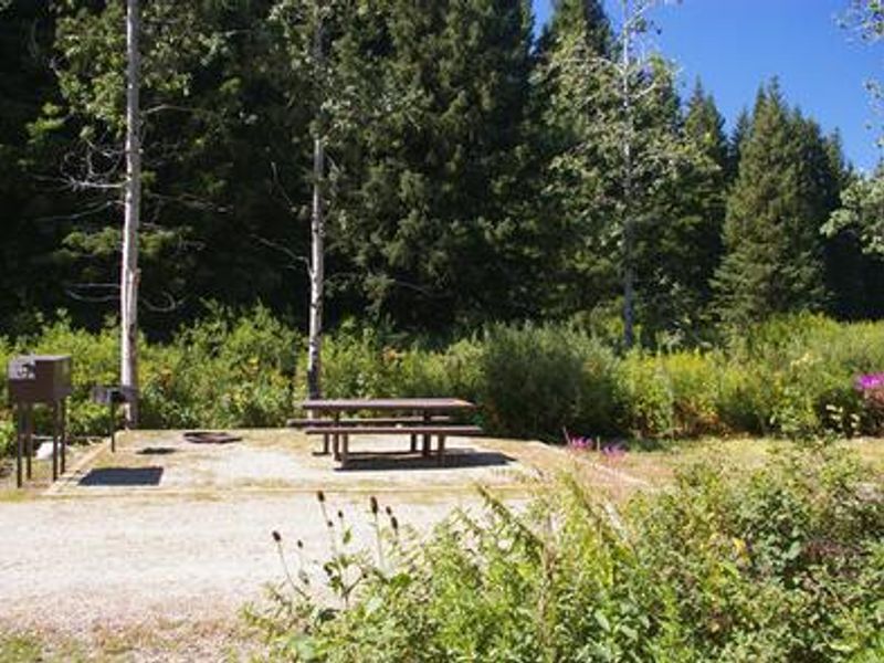 The campground offers 13 single-family sites and 2 equestrian sites, each equipped with picnic tables, campfire rings, grills, and bear-proof food lockers. Gravel roads and parking spurs accommodate RVs up to 40 feet, though there are no hookups or electricity. A horse staging area is located at the trailhead parking area for equestrian campers.
