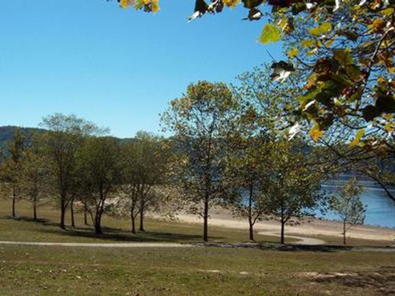 Twin Knobs Campground sits on the shores of Cave Run Lake within the Daniel Boone National Forest in northeastern Kentucky. The campground encompasses 700 acres and offers more than 200 individual campsites spread across 10 loops beneath a canopy of mixed conifer and deciduous trees. Sites are equipped with picnic tables and fire rings, and RV sites range from electric-only hookups to full hookups with water and sewer. A dump station serves the campground. The Twin Knobs Recreation Area provides extensive amenities including bathhouses with flush toilets and showers located throughout the campground, a sandy swimming beach open Memorial Day through Labor Day, a boat ramp for registered campers, a camp store, volleyball courts, basketball goals, and horseshoe pits. Summer amphitheater programs and scheduled activities offer family entertainment. Scenic hiking trails include the 2.5-mile Twin Knobs Shoreline Trail and 1.5-mile Knob Overlook Trail. Cave Run Lake is a popular destination for fishing, swimming, motor boating, windsurfing, sailing, and water skiing. The campground lies within the Cumberland Plateau region where steep forested slopes, sandstone cliffs, and narrow ravines characterize the rugged terrain. The area is surrounded by rolling hills typical of northeastern Kentucky. Group camping and two reservable group picnic areas are also available at Twin Knobs.