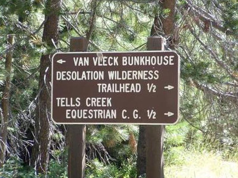 Van Vleck Bunkhouse sits at 6,000 feet elevation halfway up a small Sierra Nevada peak, overlooking a 40-acre meadow with views of the Tells Peak portion of the Crystal Range. Built in 1957, it is the last remaining building from the Van Vleck Ranch site, which operated as a cattle ranch from the 1860s to the 1960s. The bunkhouse provides a unique year-round rental experience with dramatically different access depending on season. During summer months, visitors can drive directly to the bunkhouse on dirt roads and enjoy nearby hiking, mountain biking, horseback riding on the Tells Creek Primitive Equestrian Trail into Desolation Wilderness, stream fishing in Cheese Camp Creek, and bird watching. The facility includes two rooms, a kitchen with propane stove, gas log heater, sleeper sofa and bunk beds in the main area, plus a bedroom with another bunk bed and queen-size bed. The indoor bathroom has a flush toilet, shower, and running hot and cold water supplied by a well during summer, though water should be conserved as supply is limited. Winter access from January 1 through May 15 requires intermediate to advanced backcountry skiing or snowshoeing skills. The 6-mile route from Loon Lake Campground parking area gains 1,300 feet and is marked by blue reflective diamonds, passing over the South Fork Rubicon River bridge, through an aspen grove and past Milkhouse Meadow. The water system is shut down in winter due to freezing temperatures, so visitors must bring water or melt snow. A storm shelter is located at mile 2.4 of the winter route. Guests must contact the forest at least 7 days prior to arrange permits, gate combinations, and check current conditions.