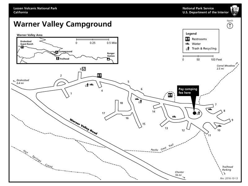 Warner Valley Campground offers a primitive camping experience in the remote southeastern corner of Lassen Volcanic National Park. Nestled at the base of a steep mountainside amid conifer trees at 5,650 feet elevation, this 18-site campground provides a peaceful escape with access to excellent hiking trails and geothermal features. The campground is managed by park concessionaire Snow Mountain, LLC. Each campsite is equipped with a picnic table, fire grate, and bear-proof storage box. The campground provides vault toilets and potable water spigots during the operating season. No hookups, showers, or other modern amenities are available, though nearby Drakesbad Guest Ranch (half a mile away) offers meals, hot showers, and limited supplies for purchase. Full services including groceries, gasoline, and laundromat facilities are available in Chester, 17 miles south. Access requires navigating 17 miles of partly paved and gravel roads from Chester, with the final stretch being steep and rutted. This road is not recommended for RVs or trailers. The campground offers 17 reservable sites and 1 first-come, first-served site. Due to elevation and snowpack, the season typically runs from mid-June through mid-October, weather permitting. The Warner Valley area showcases Lassen's volcanic diversity and provides a quieter alternative to the park's more developed campgrounds.