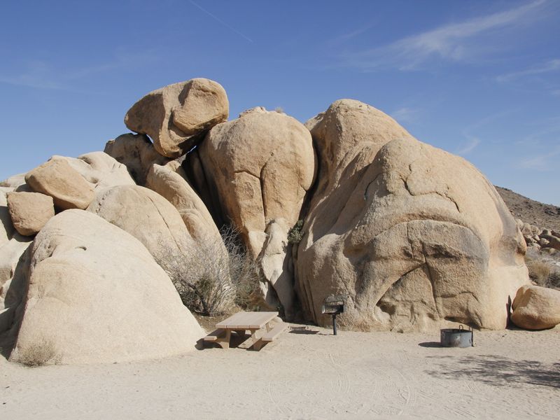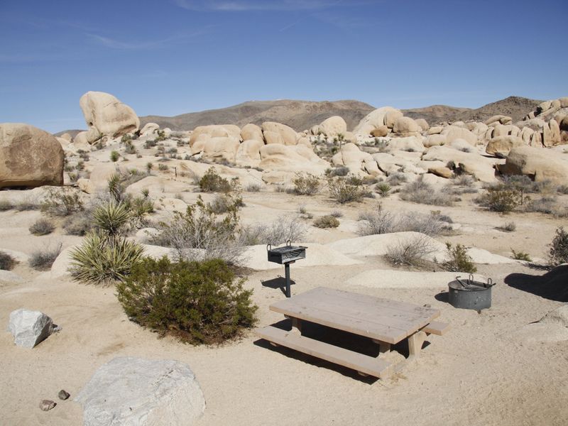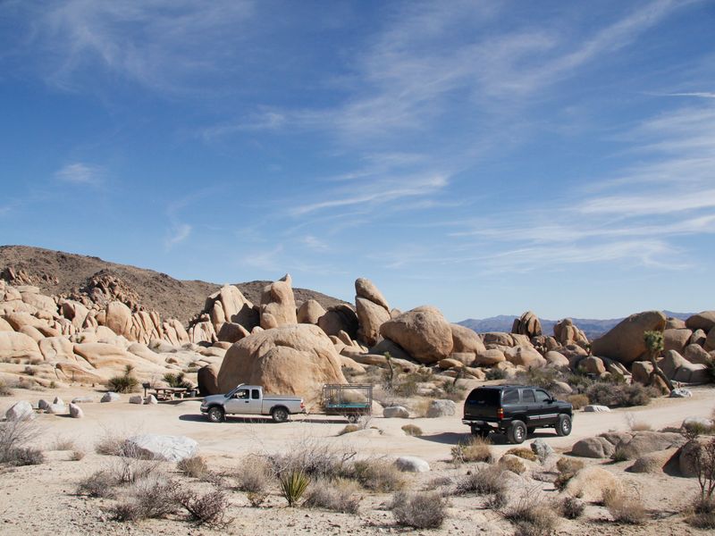 White Tank Campground is a small, intimate campground located in the northern section of Joshua Tree National Park, just off Pinto Basin Road. With only 15 sites, it offers a quieter, more secluded camping experience compared to the park's larger campgrounds. The campground sits at the transition point before Pinto Basin Road descends into the Colorado Desert, providing access to nearby trails including Arch Rock and Heart Rock. All sites are available on a first-come, first-served basis year-round. To claim a site, campers must locate an empty spot, set up to show occupancy, and pay at an entrance station within one hour. Each site includes a picnic table, fire pit, and parking area, though site sizes vary considerably. The campground has vault toilets but no water, so visitors must bring all water needed for drinking, cooking, and cleaning. Due to size constraints, RVs and vehicles with trailers are limited to a combined maximum length of 25 feet. The campground can accommodate up to six people and three tents per site if space allows, though some sites only have room for one vehicle. White Tank typically fills more slowly than other Joshua Tree campgrounds, but expect high occupancy from September through May during peak season.