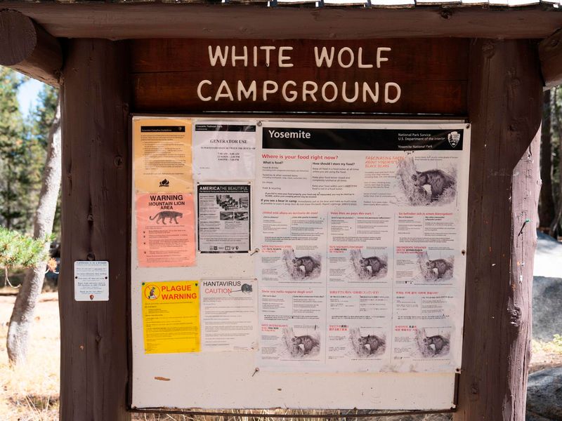 White Wolf Campground is located off Tioga Road 24 miles west from Tioga Pass. From Yosemite Valley, take Big Oak Flat Road and Tioga Road 31 miles (approximately 1 hour). From Highway 120 west/Big Oak Flat Road, take Tioga Road 31 miles (35 minutes). The campground is approximately one mile north of Tioga Road.