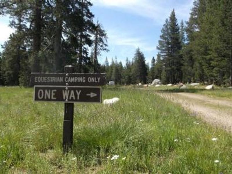 Wrights Lake Equestrian Campground is a specialized facility at nearly 7,000 feet elevation in Eldorado National Forest, exclusively serving visitors traveling with horses or other pack animals. The campground features 15 sites situated in a grassy, open timber stand shaded by large lodgepole and fir trees, located near the stream flowing from Wrights Lake's spillway. The campground provides equestrians with access to multiple trails leading into the backcountry and Desolation Wilderness, with an equestrian trail map posted on-site. Stock users must stay within designated areas and may not ride through the regular Wrights Lake Campground and Day Use areas. The nearby 40-acre Wrights Lake offers trout fishing, swimming, and paddling in a serene setting where motorboats are prohibited. Each site accommodates tents or RVs up to 35 feet and includes a table, campfire ring with grill, and space for up to two vehicles including horse trailers and six people. Firewood can be gathered in the area. The campground has accessible vault toilets and drinking water from faucets. Note that one equine or pack animal is required per site, and campers without stock will be required to leave without refund.
